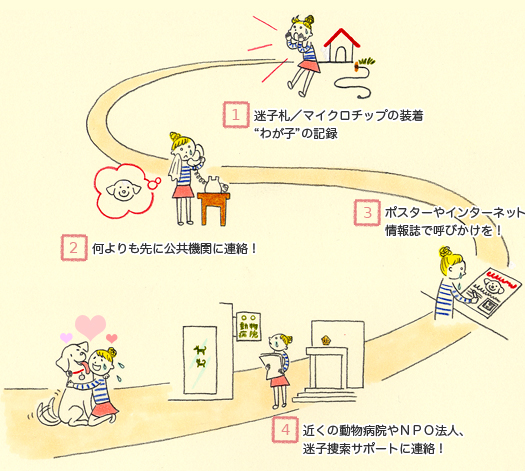 また迷子捜索サポート活動をしている民間企業には、日頃からこうした迷子の情報が寄せられています。インターネットやペット関連の雑誌で連絡先を調べて、コンタクトをとってみましょう。迷子捜索の力強い味方になってくれます。 |