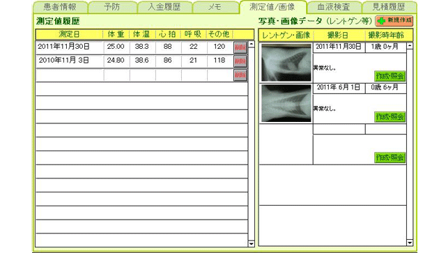 検査結果画面では「レントゲン写真」、「血液検査履歴」、「測定値履歴」を一覧できます。