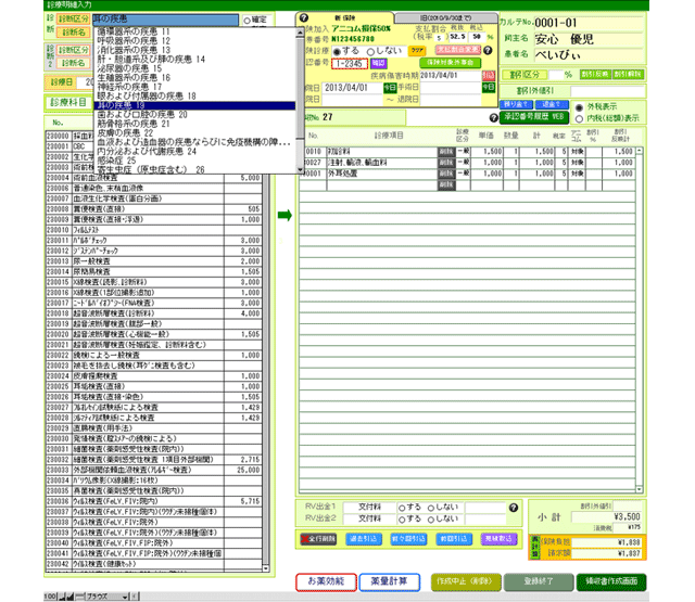 診療明細の作成はもちろん、治療費や保険適用額も自動的に計算するので、会計時に患者さんをお待たせしません!