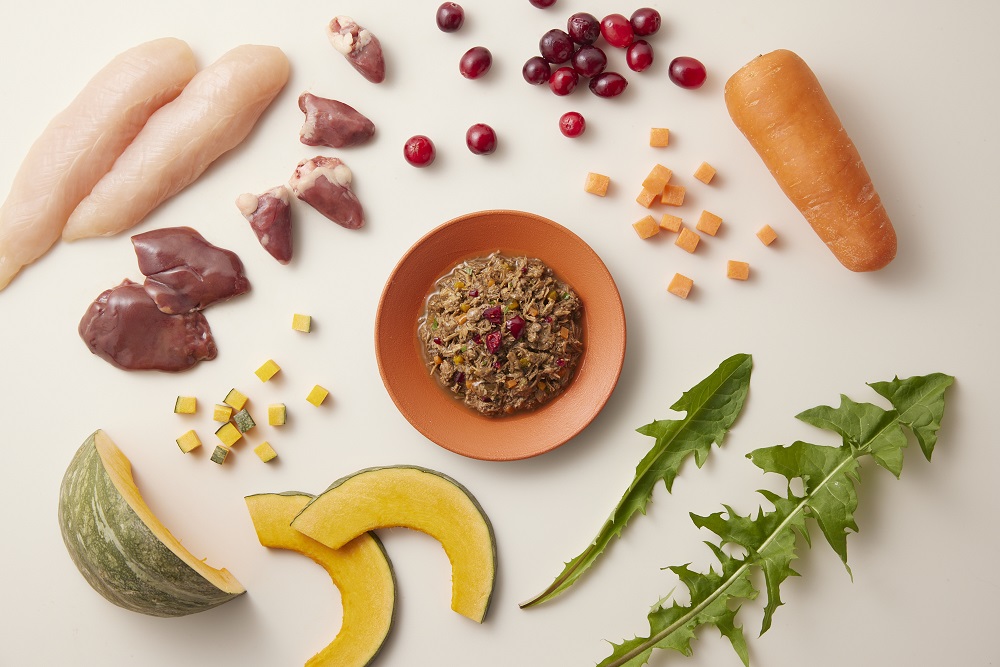 原材料:鶏肉、鶏(レバー、ハツ)、かぼちゃ、にんじん、米でん粉、加水分解チキン、卵白、フィッシュオイル(オメガ3脂肪酸源) 、デキストリン、クランベリー、ダンデライオンエキス、乳酸菌(殺菌)、クコの実パウダー、タウリン