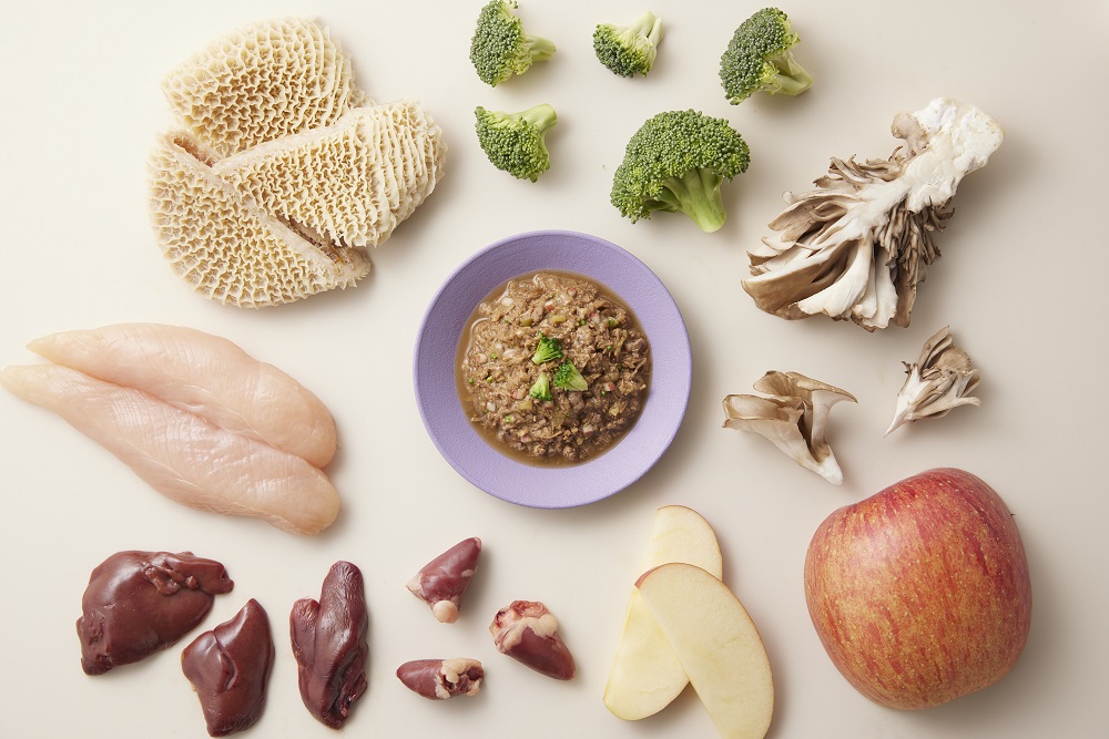 原材料:鶏肉、鶏(レバー、ハツ)、ブロッコリー、りんごピューレ、米でん粉、加水分解チキン、フィッシュオイル(オメガ3脂肪酸源)、フラクトオリゴ糖、舞茸エキス、デキストリン、殺菌乳酸菌(フェカリス菌)、殺菌乳酸菌(シールド乳酸菌®)、ビフィズス菌(殺菌)、タウリン