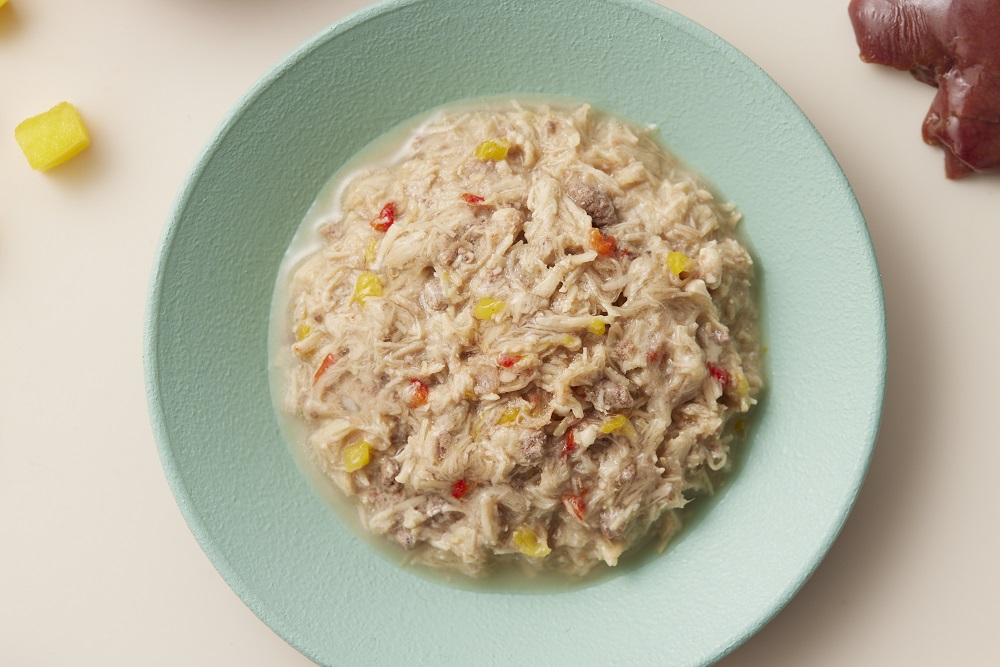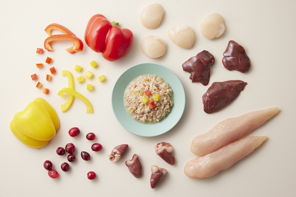 原材料:鶏肉、鶏(レバー、ハツ)、パプリカ、ホタテエキス、米でん粉、加水分解チキン、フィッシュオイル(オメガ3脂肪酸源)、デキストリン、クランベリー、海藻抽出物アスコフィラン、ポリグルタミン酸、リベチン含有卵黄粉末、オリゴ糖、殺菌乳酸菌(クリスパタス菌KT-11株)、タウリン