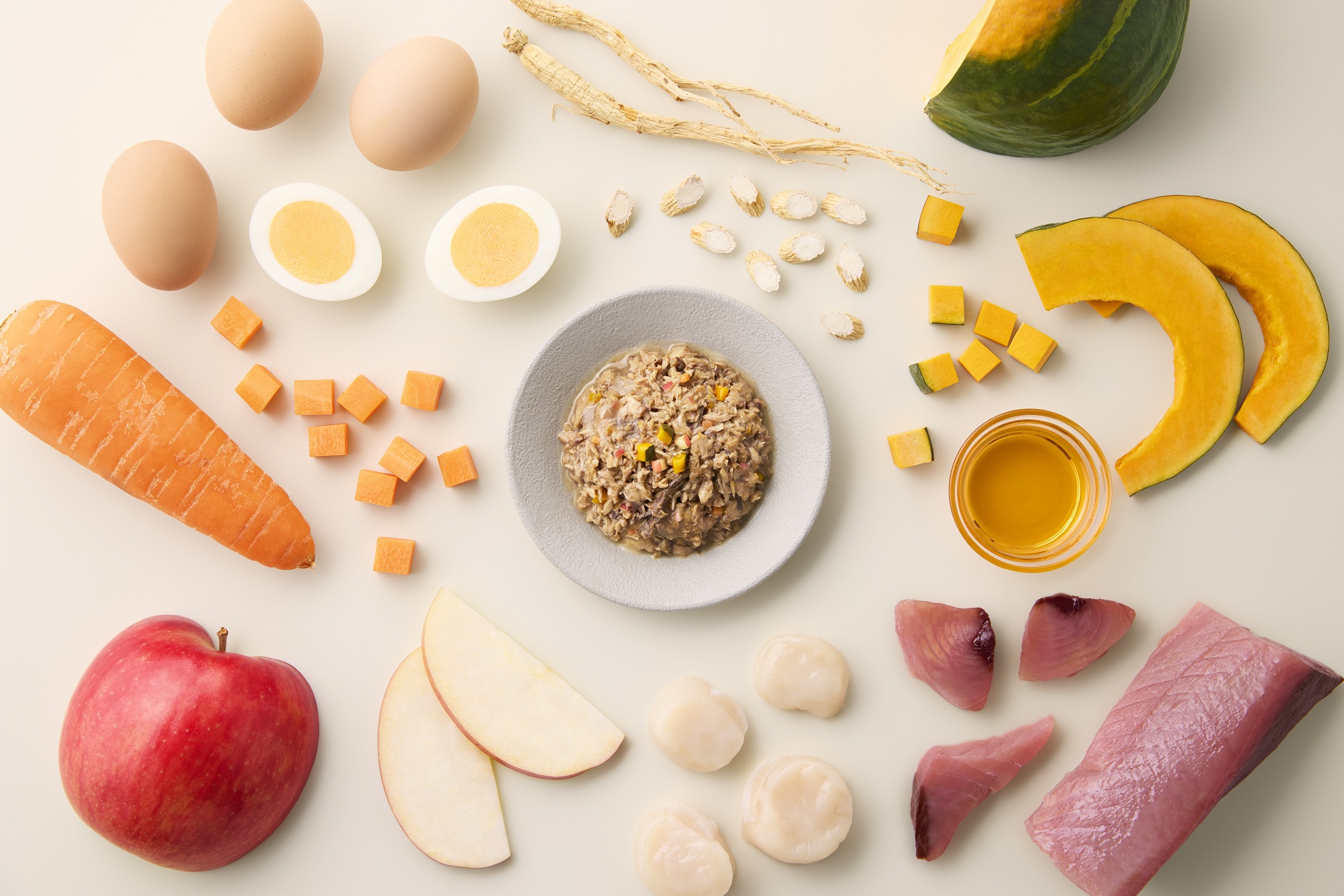 原材料:かつお、かぼちゃ、人参、加水分解フィッシュ、りんごピューレ、ほたてエキス、鶏卵、フィッシュオイル、米でん粉、フラクトオリゴ糖、チコリ根抽出物、ビール酵母、キトサン、タウリン