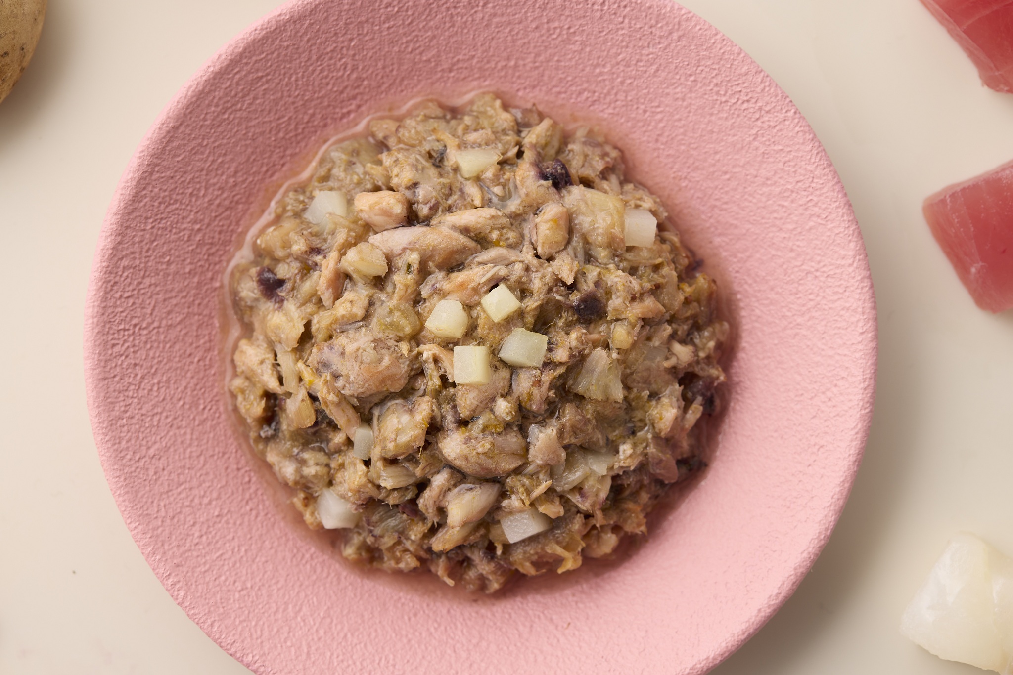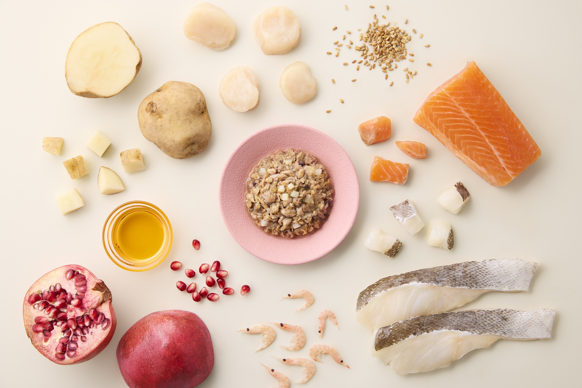 原材料:キングサーモン、スケソウダラ、ほたてエキス、加水分解フィッシュ、りんごピューレ、クリルオイル、フィッシュオイル、亜麻仁、じゃがいも、米でん粉、フラクトオリゴ糖、ザクロパウダー、寒天、タウリン、デキストリン、殺菌乳酸菌粉末