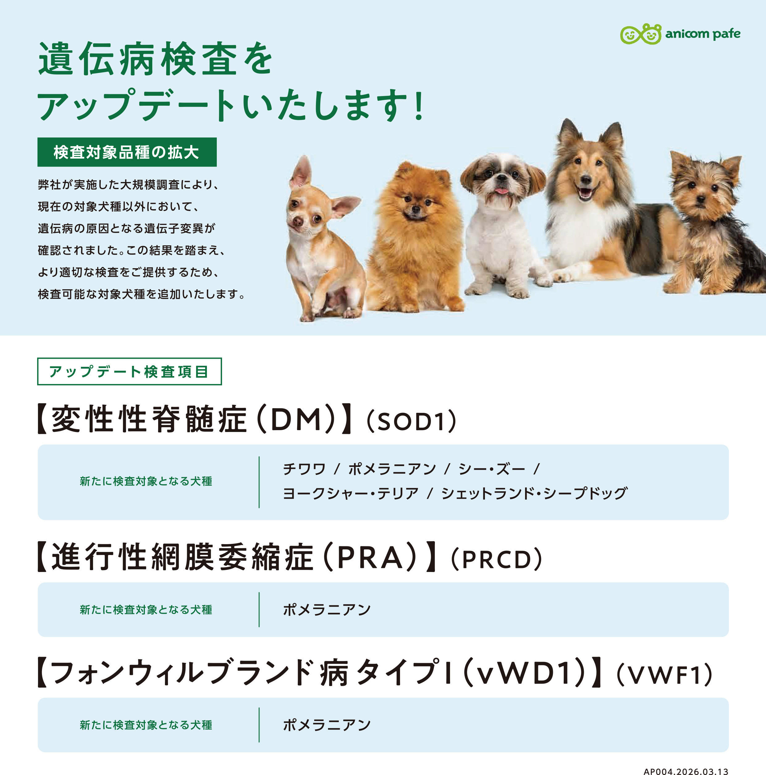 アニコム パフェ株式会社(本社:東京都新宿区、代表取締役社長:安宅 快、以下「当社」)は、ブリーダー様向けにご提供している遺伝病検査について、2026年4月1日より新たに検査対象品種を追加いたしましたので、ご案内申し上げます。